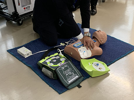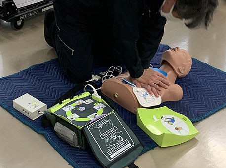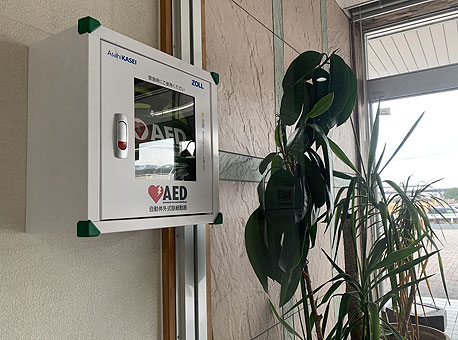 AED(自動体外式除細動器)を設置しました。使用方法の説明を受け、操作の体験をしました。従業員や来社されるお客様、地域住民の方々の万一に備えて設置しました。事務所正面入口と工場入口の社名板にAED設置施設であることをお知らせするステッカーを貼り付けております。一般の方ももしものときは早急にお声がけください。ただし、営業時間(月〜金/8:00〜17:00)及び本社事務所に社員がいる場合のみになりますので予めご了承ください。