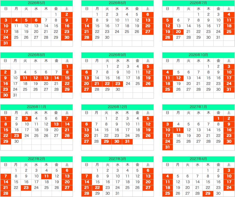 2026年度(2026年5月〜2027年4月)の営業日のお知らせ